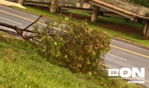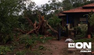 No total, foram 5 árvores derrubadas pelos ventos aqui na cidade, 2 árvores na zona rural, 2 árvores na rodovia Pe Donizetti, algumas telhas em residência e um comércio de utensílios que teve uma telha de amianto arrancada com a força do vento.